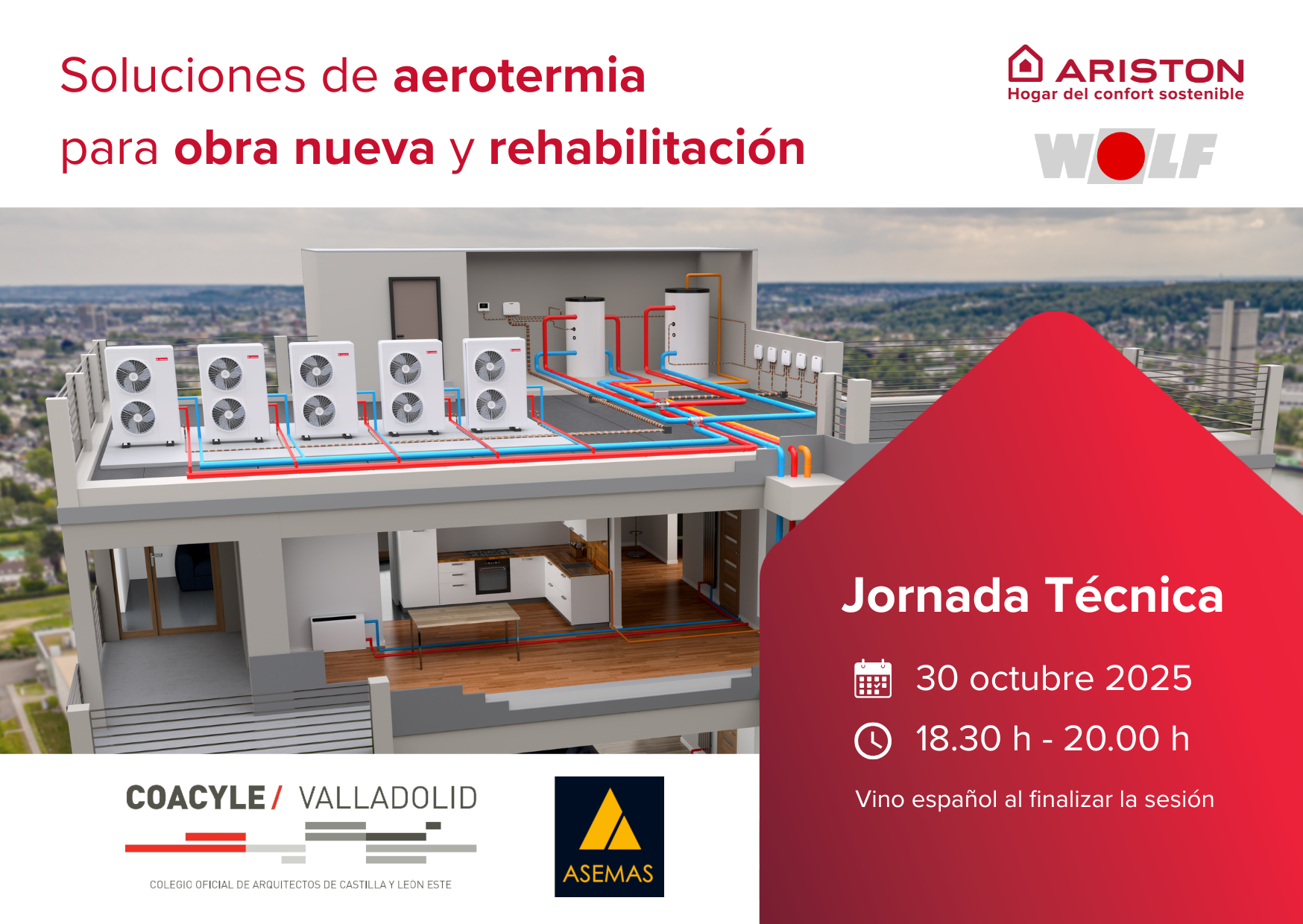 VII CONGRESO ITE+3R EN PALENCIA. 09:00 VII CONGRESO ITE+3R EN PALENCIA. @ CENTRO CULTURAL PROVINCIAL DE PALENCIA. Oct 27 a las 09:00 – Oct 28 a las 14:15 El Instituto de la Construcción de Castilla y León ha organizado el VII Congreso ITE+3R, que se celebrará en el Centro Cultural Provincial de Palencia los días 27 y 28 de octubre de 2025. Bajo … | JORNADA TÉCNICA SOLUCIONES DE AEROTERMIA PARA OBRA NUEVA Y REHABILITACIÓN. 18:30 JORNADA TÉCNICA SOLUCIONES DE AEROTERMIA PARA OBRA NUEVA Y REHABILITACIÓN. @ COLEGIO DE ARQUITECTOS DE VALLADOLID Oct 30 a las 18:30 – 20:00 El Colegio Oficial de Arquitectos de Valladolid y ARISTON GROUP organizan la Jornada técnica SOLUCIONES DE AEROTERMIA PARA OBRA NUEVA Y REHABILITACIÓN, a desarrollar el jueves día 30 de octubre en formato presencial en el Salón … JORNADA TÉCNICA SOLUCIONES DE AEROTERMIA PARA OBRA NUEVA Y REHABILITACIÓN. Leer más » |