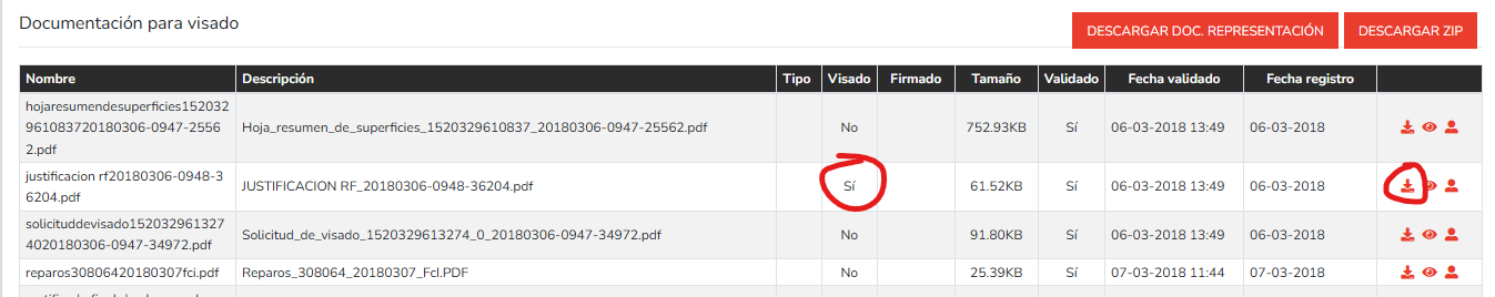 En el listado se muestra información de cada documento visado, pudiéndolo descargar desde el icono situado a la derecha.