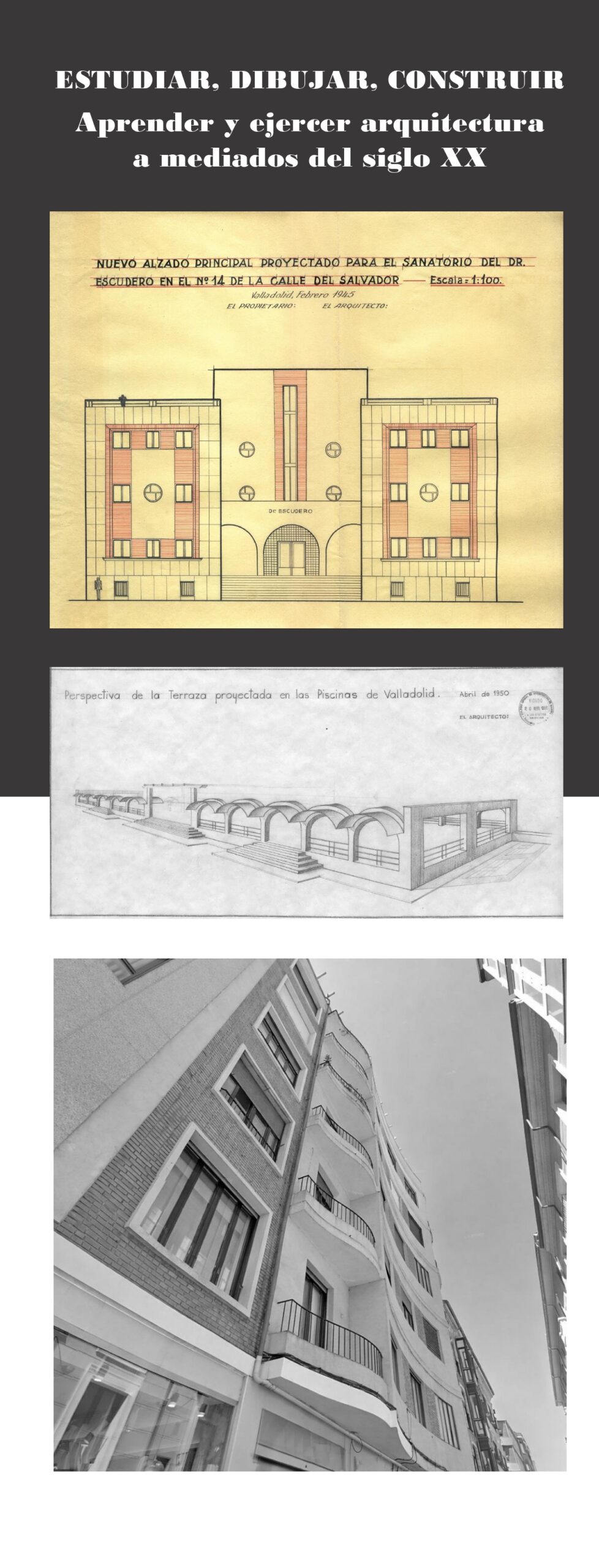La Escuela Técnica Superior de Arquitectura de Valladolid acoge la exposición ESTUDIAR, PROYECTAR, CONSTRUIR. Aprender y ejercer la arquitectura a mediados del siglo XX, comisariada por el Dr. arquitecto F. Javier Carbayo Baz.