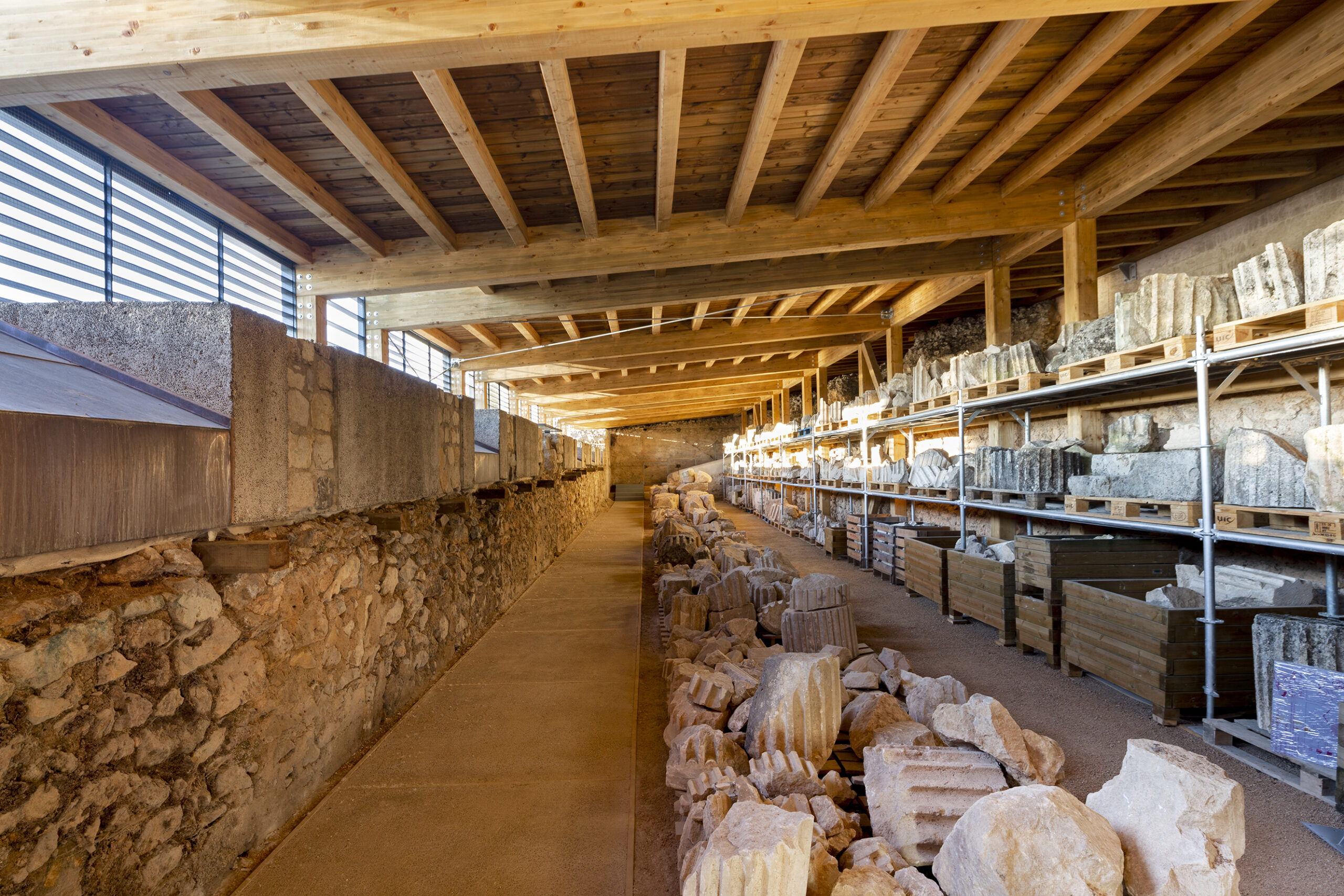 Tras esta segunda fase de restauración se reconfigura el edificio escénico del teatro. Detrás del muro donde se realizan las representaciones, existe una pasarela de madera que permite el paso de los actores y bajo ella se encuentra un pabellón semienterrado que incorpora una nueva utilidad al teatro: la de exponer y proteger los restos en un anticuario y a la vez usar ese espacio cubierto como vestuario.